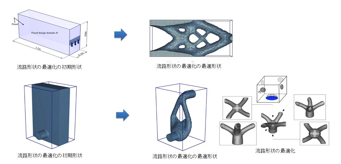 構造の体積を減らしつつ剛性を最大化する形状を最適化を最適化する技術、車室内・ホールなどの静音化や音響特性を最適化する音場形状の最適化技術、固有振動数が最適な値となるように逆に構造の形状を決定する技術、電場・磁場強度をコントロールする誘電体・散乱体の形状の最適化技術、金型キャビティーの温度をより高精度にコントロールするための3Dプリンタを志向した冷却管の形状や配置の最適化技術、圧力損失を最小化・最大化できる流路の形状・トポロジー最適化技術など、有限要素法・境界要素法・格子ボルツマン法をレベルセット法と組み合わせた高度な構造最適化手法を開発している。計算の過程で、構造をメッシュに分割し直しており、計算は高精度に行われ、得られた形状から3Dプリンター用のSTLデータは直接出力される。また、従来の方法では精度が低い固有振動数を最適化するトポロジー最適化も高精度に実行することが可能となる。